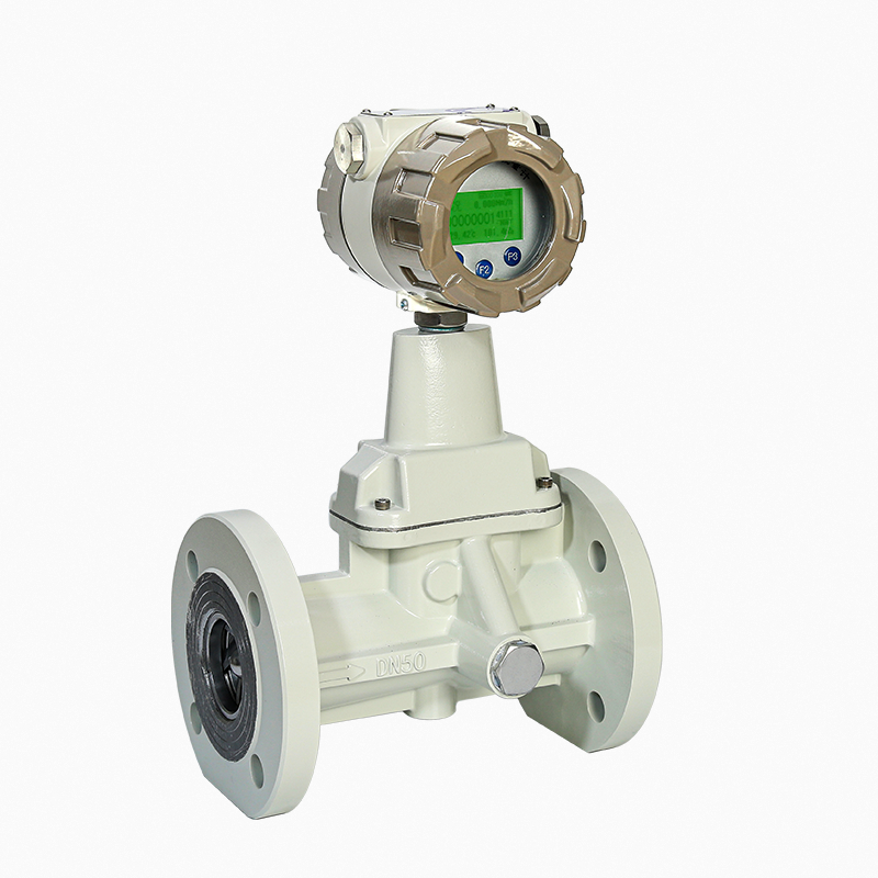 流量傳感器的流通剖面類似文丘利管的型線,在入口側(cè)安放一組螺旋型導(dǎo)流葉片,當(dāng)流體進(jìn)入流量傳感器時,導(dǎo)流葉片迫使流體產(chǎn)生劇烈的旋渦流。當(dāng)流體進(jìn)入擴(kuò)散段時,旋渦流受到回流的作用,開始作二次旋轉(zhuǎn),形成陀螺式的渦流進(jìn)動現(xiàn)象。該進(jìn)動頻率與流量大小成正比,不受流體物理性質(zhì)和密度的影響,檢測元件測得流體二次旋轉(zhuǎn)進(jìn)動頻率就能在較寬的流量范圍內(nèi)獲得良好的線性度。信號經(jīng)前置放大器放大、濾波、轉(zhuǎn)換為與流速成正比的脈沖信號,然后再與溫度、壓力等檢測信號一起被送往微處理器進(jìn)行積算處理,液晶顯示屏上顯示出測量結(jié)果(瞬時流量、累積流量及溫度、壓力數(shù)據(jù))。產(chǎn)品特點(diǎn)